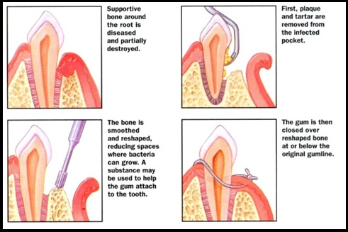 Flap surgery/pocket reduction surgery : During this procedure under local anaesthesia ,the gums are lifted and the tarter beneath the gums is removed. In some cases, irregular surfaces of the damaged bone are smoothed so that bacteria don’t hide. The gums are then returned to place so that it fits firmly around the tooth. This method reduces the size of the space between the gum and tooth, where harmful bacteria can grow.