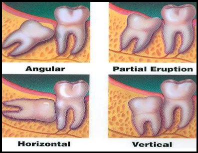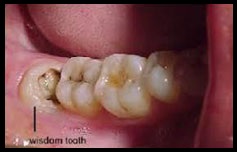 Wisdom teeth are the last teeth to erupt in the mouth. Technically they are called the 3rd molars, because they erupt behind the 2nd molars in the mouth. We have 4 wisdom teeth, two in the upper arch and two in the lower. The wisdom teeth are the ones least needed for good oral health. They may not erupt or emerge from your gums until your late teens or early twenties if they erupt at all. Most often they are impacted or trapped in the jaw-bone and gums, usually because there is not enough room for them in your mouth.