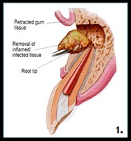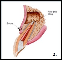 Once the tooth is completely numb, the gum is lifted to expose the underlying bone and root tip of the tooth. The root tip and all surrounding infected tissue are removed. A retrograde filling may be placed at the root tip. The gum is repositioned and stitches are placed.